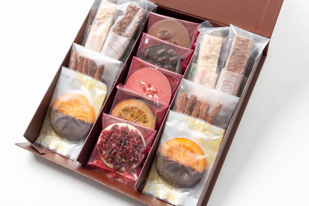 個包装の商品をひとつ一つ確認しながら箱に詰めるのも手作業。蓋を開けた時に商品がきれいに見えるように、個包装の上部を丁寧に折り曲げてひとつずつ箱詰めしています。マグネットで閉められた蓋を開けると、多彩なチョコレートがお出迎え。付属の紙袋も含め、トータルで洗練された上質さを演出しています。フォーマルな贈り物、法人向けのギフト、そして特別な記念日などでもお使いいただけます。