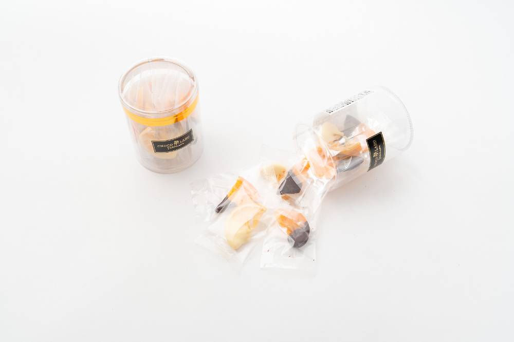 どの角度から見てもきれいに見えるように、12枚のドライフルーツチョコレートを筒の中にひとつ一つ手作業で配置しています。仕上げは、ドライフルーツの華やかさを引き立てるよう金色のテープを巻きます。「可愛い♡」「きれい☆」と、ワクワクする見た目は、自分へのご褒美やちょっとしたお礼の品としてもピッタリです。