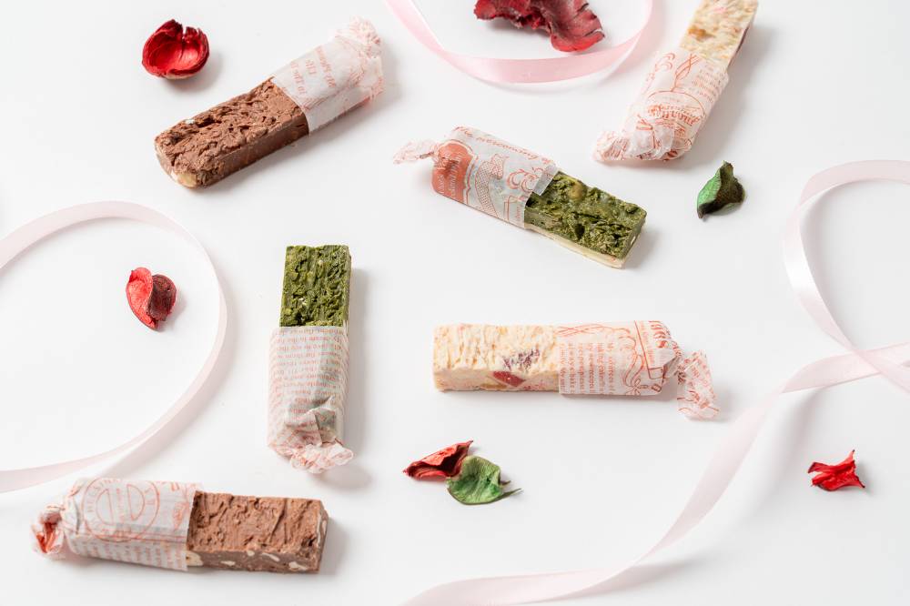 一本で多彩な食感を楽しめる、素材にこだわったショコラバー。ブラックには砂糖で丁寧にコーティングしたナッツとローストナッツを使用し、甘さと香ばしさを両立。さらに薄焼きクレープを混ぜ込むことで、軽やかなサクサク食感が広がります。ホワイトは、風味豊かなドライフルーツと薄焼きクレープを合わせているので、やさしい甘さの中にしっとり感と軽快さのコントラストを感じられます。