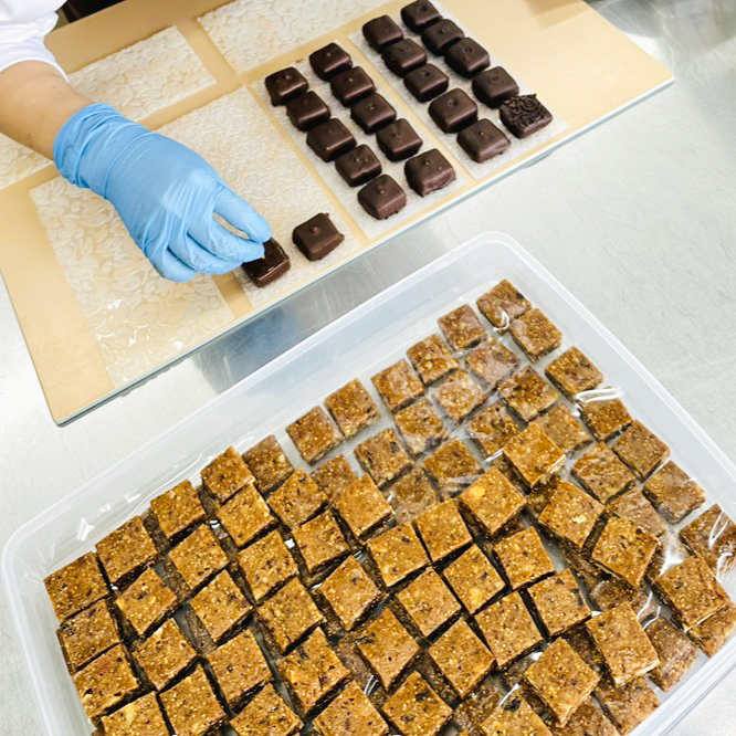 ショコラボでは、約40名の個性豊かな作り手たちが、それぞれの得意なことを活かしながら、ひとつ一つ丁寧にチョコレートを手作りしています。徹底した衛生管理のもと、繁忙期には5ヶ月で32万個もの商品が手作業によって作られます。