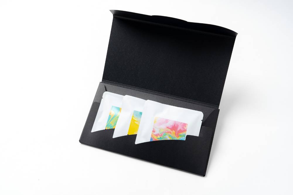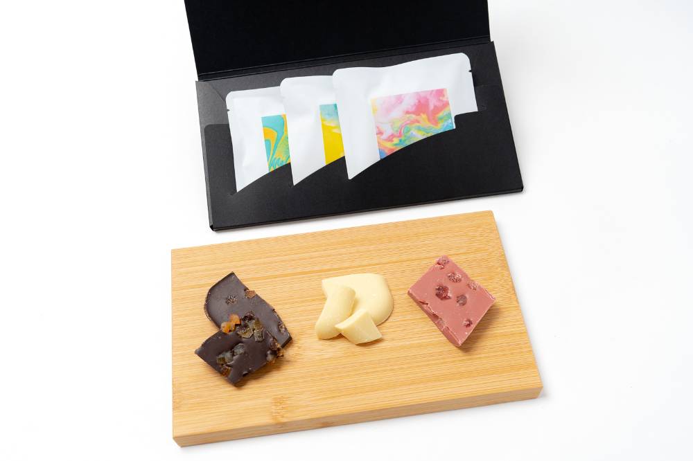 パッケージを彩るのは、ショコラボのメンバーが制作した独創的なアートワーク。「マーブリング」という技法で描かれた色彩豊かなデザインです。食べた後も取っておきたくなるような、想いの詰まったパッケージです。