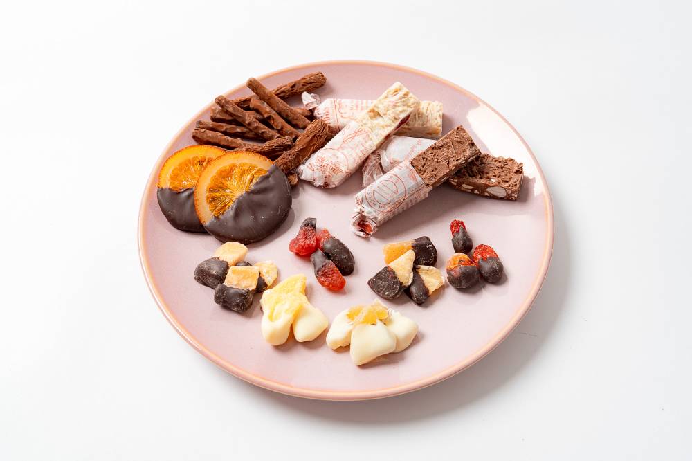 6種類のセミドライフルーツ(キウイ・パイン・メロン・リンゴ・トマト・イチゴ)を一つ一つ丁寧にクーベルチュールチョコにディップしたショコラボの看板商品。